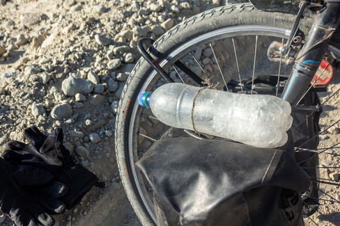 I began to worry about finding water too. I was down to perhaps half a litre but every small patch of water I spotted seemed not to be moving which, for me, is the first thing I look for in a source of water. As I cycled on though, I stopped and went down to take a closer look. Once I had smashed through the ice, the water was thankfully running quite wildly and so I filled up with haste before the gale force winds blew my bike down the side of the cliff.